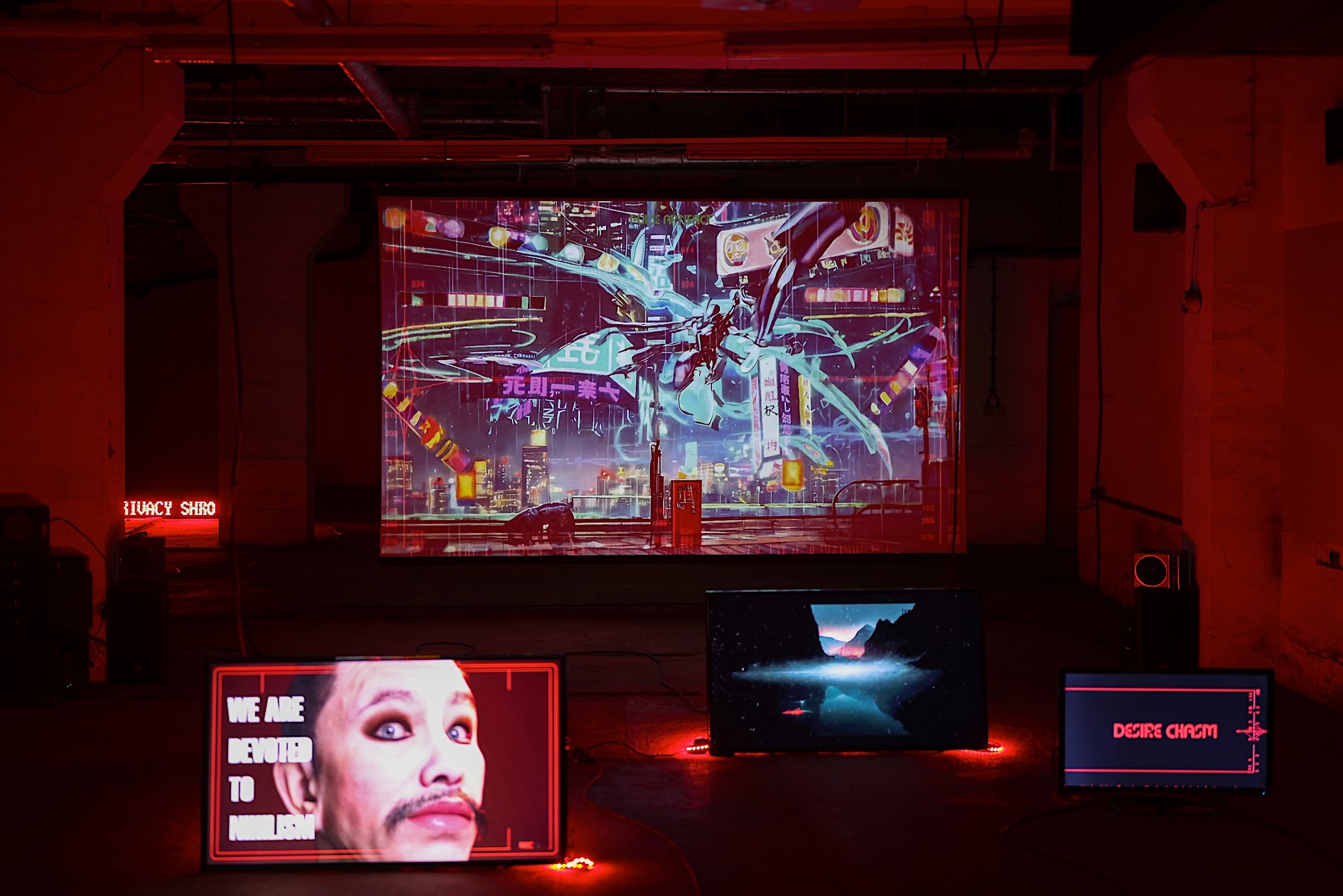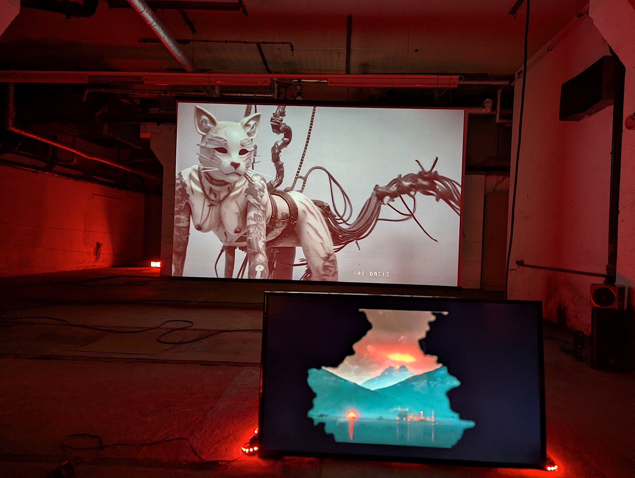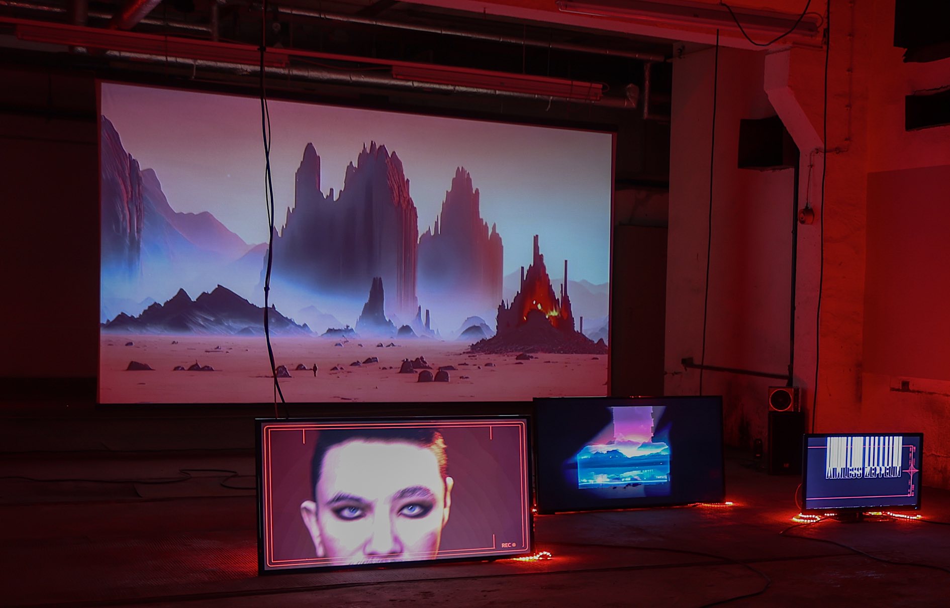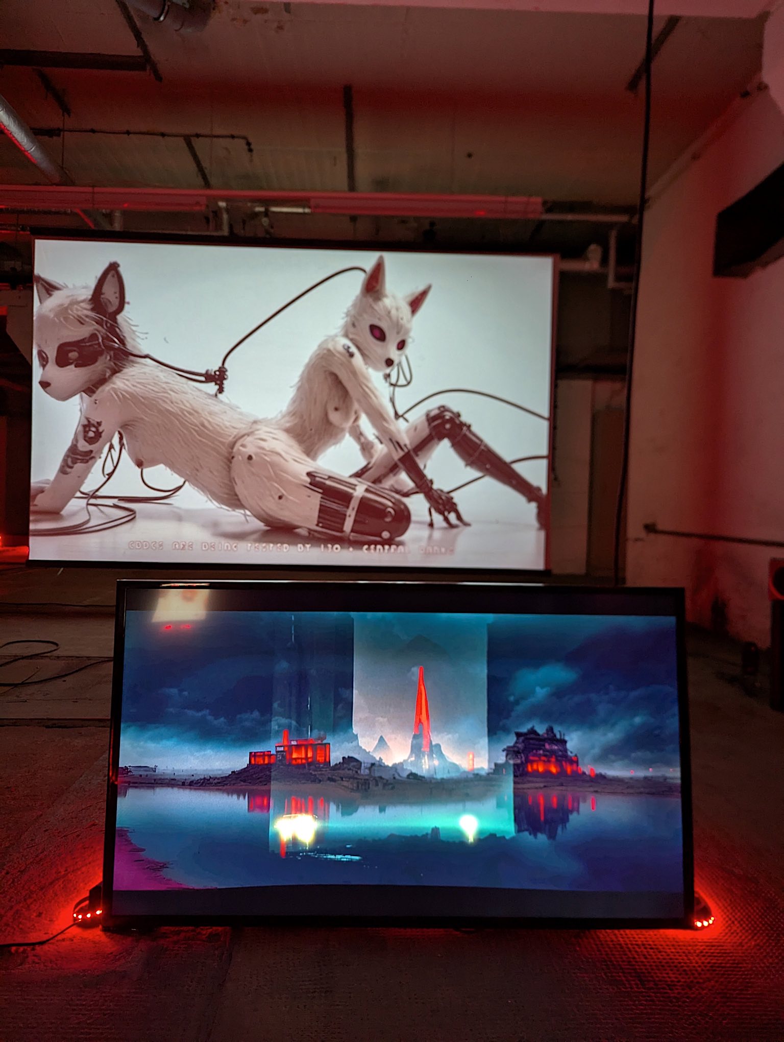 Deep within a subterranean space lit by the pulse of screens and wires, Radiances (2.0) transforms the abandoned into the sacred. This immersive installation stages a ritual in which machines appear to dream. Drawing from the aesthetics of tech-noir, crypto-culture, and AI mysticism, the work draws viewers into a fractured zone where identity, memory, and emotion circulate through synthetic veins.