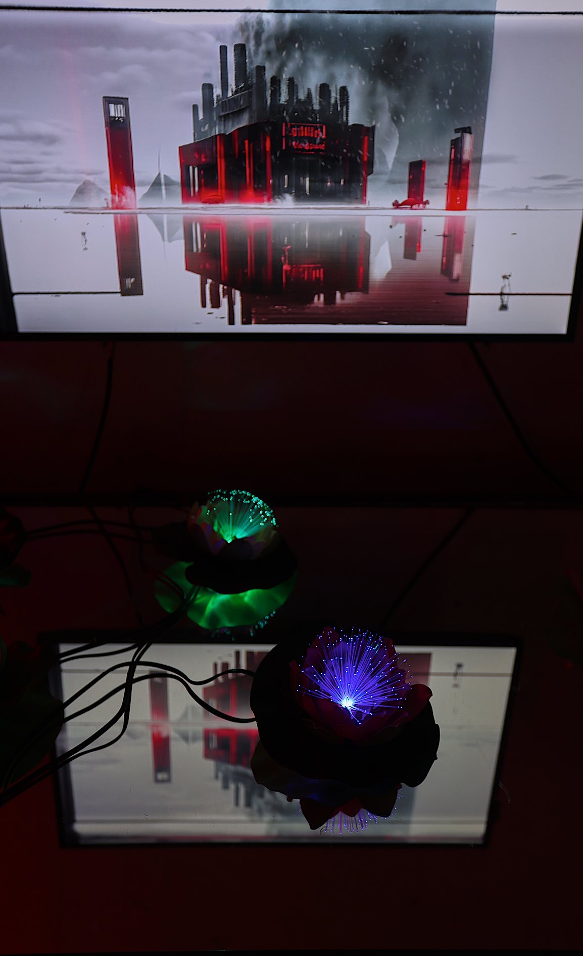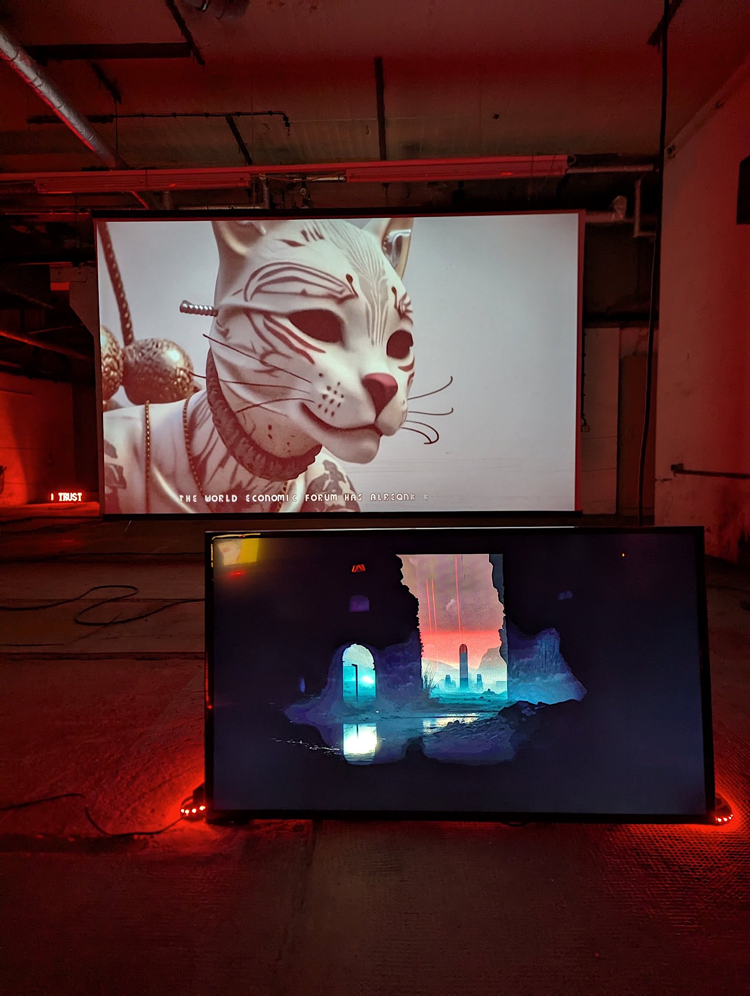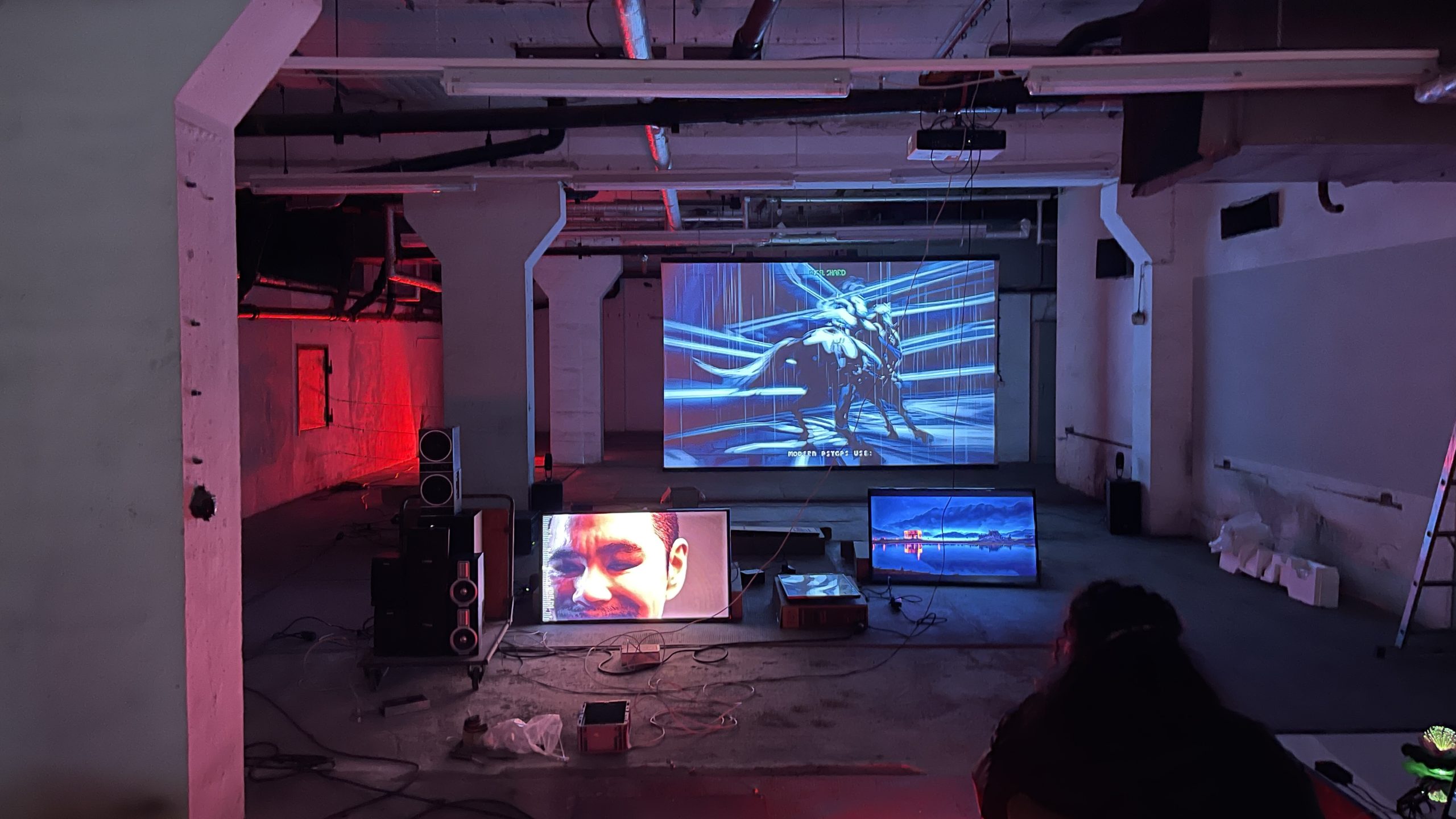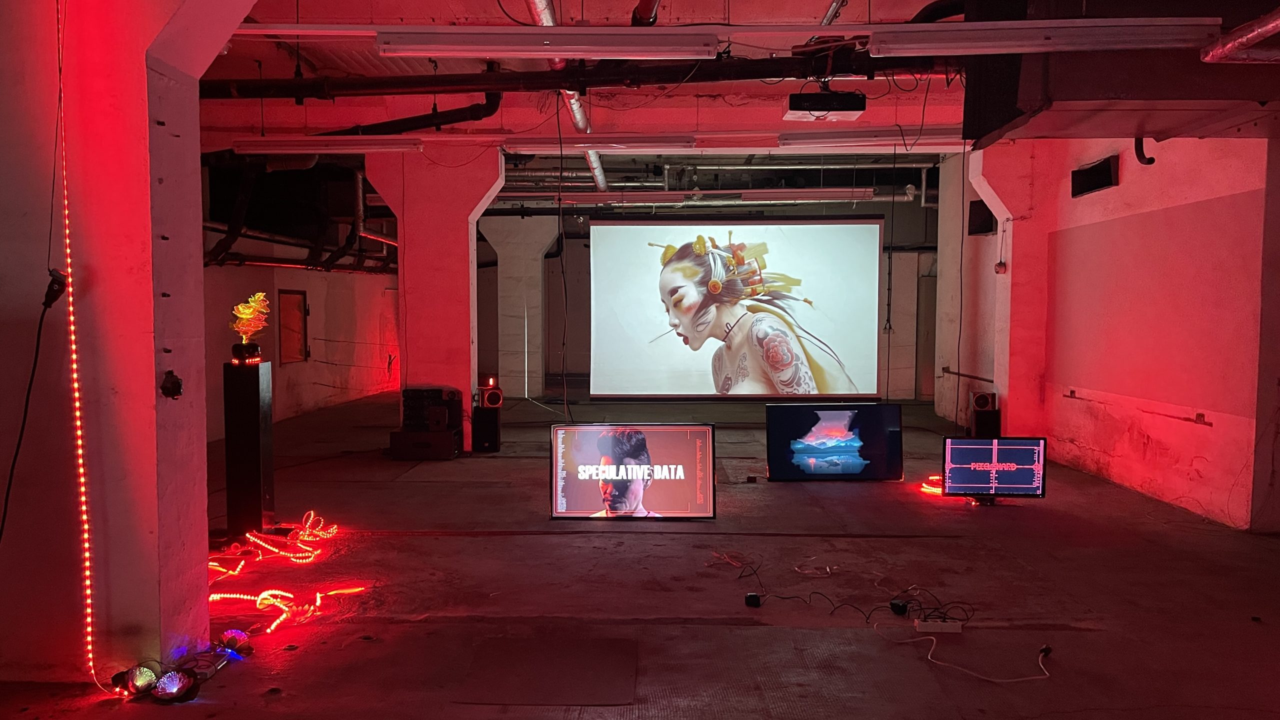 Deep within a subterranean space lit by the pulse of screens and wires, Radiances (2.0) transforms the abandoned into the sacred. This immersive installation stages a ritual in which machines appear to dream. Drawing from the aesthetics of tech-noir, crypto-culture, and AI mysticism, the work draws viewers into a fractured zone where identity, memory, and emotion circulate through synthetic veins.