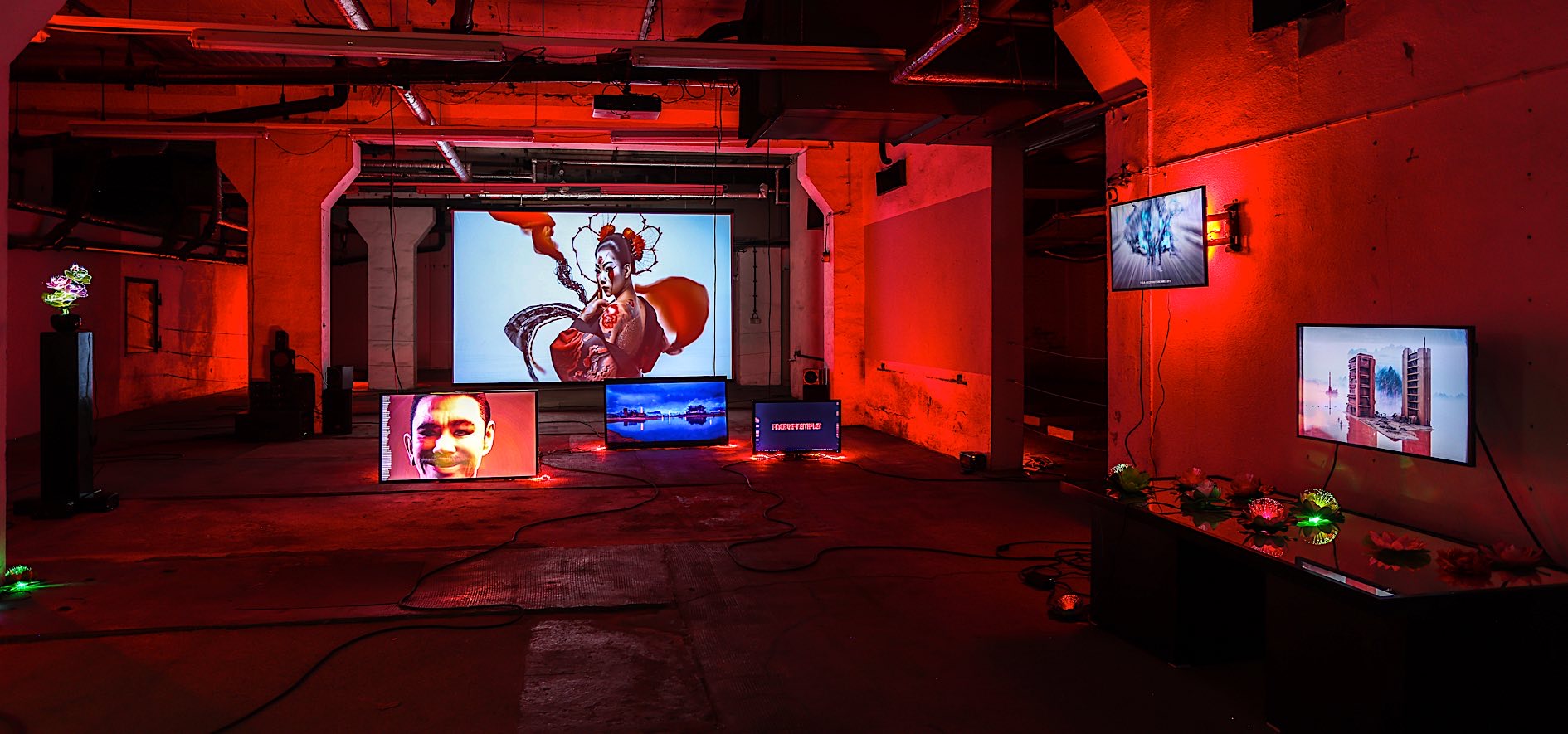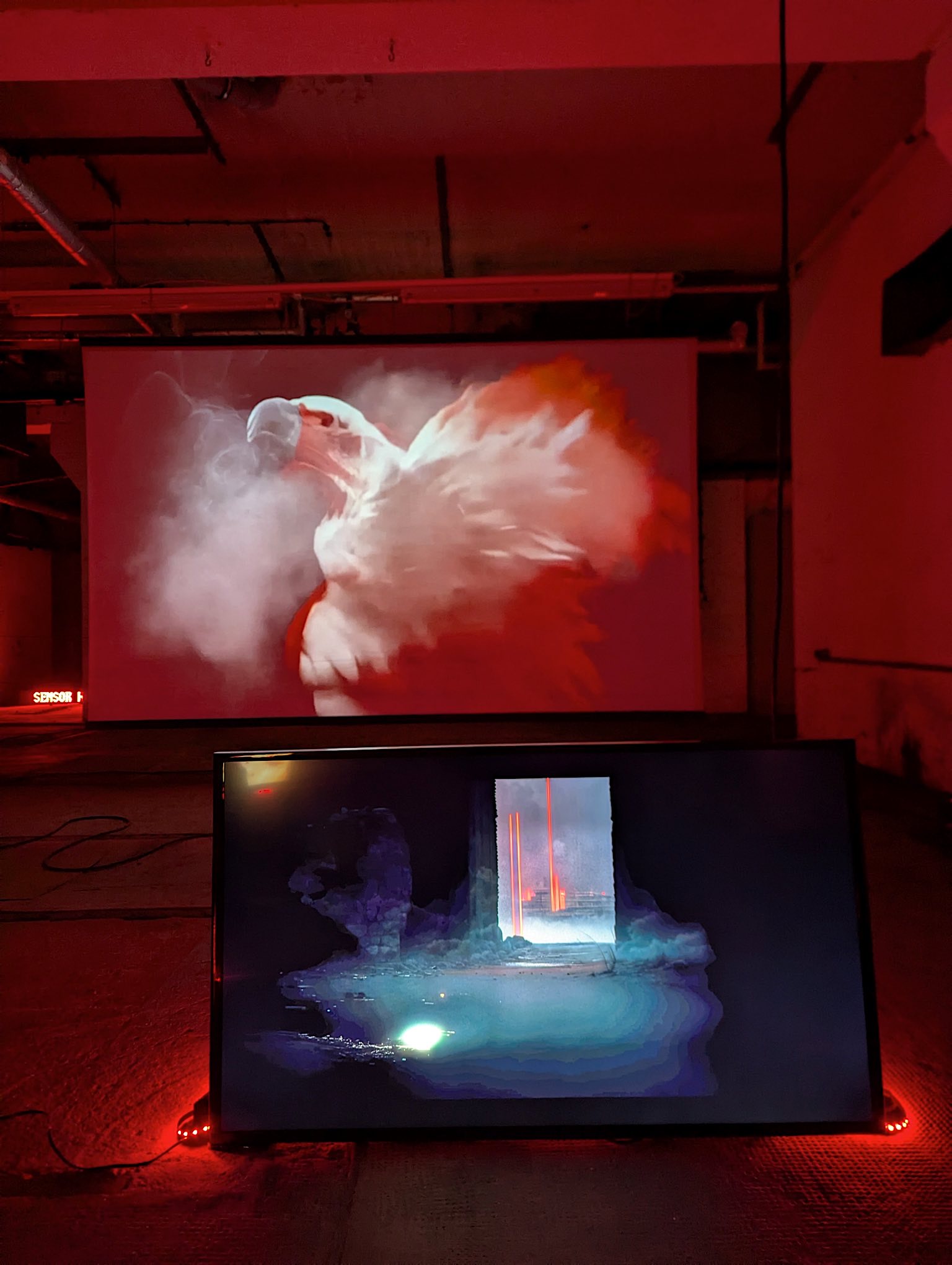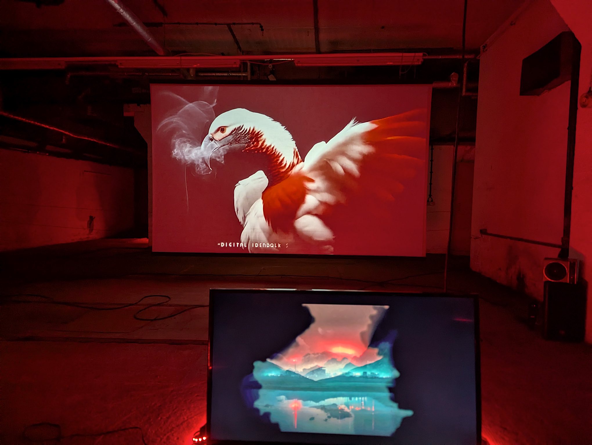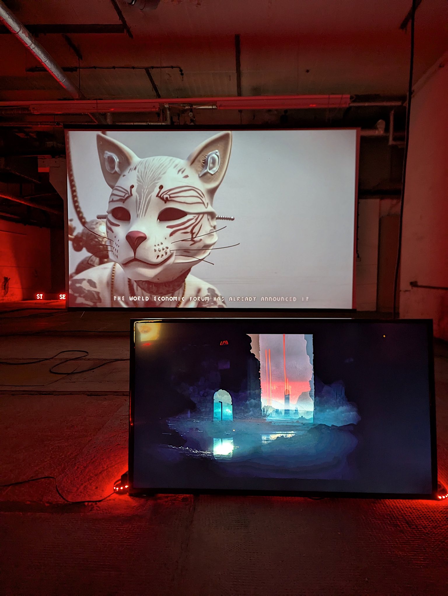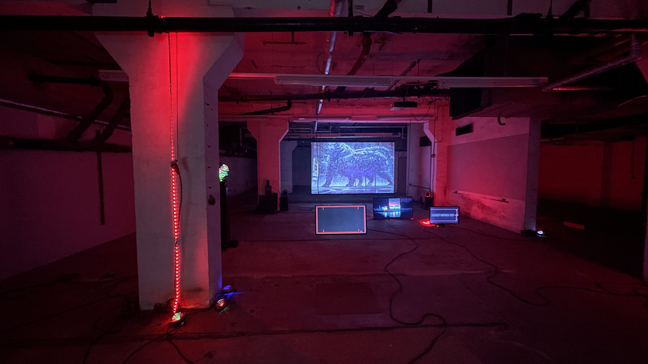 Deep within a subterranean space lit by the pulse of screens and wires, Radiances (2.0) transforms the abandoned into the sacred. This immersive installation stages a ritual in which machines appear to dream. Drawing from the aesthetics of tech-noir, crypto-culture, and AI mysticism, the work draws viewers into a fractured zone where identity, memory, and emotion circulate through synthetic veins.