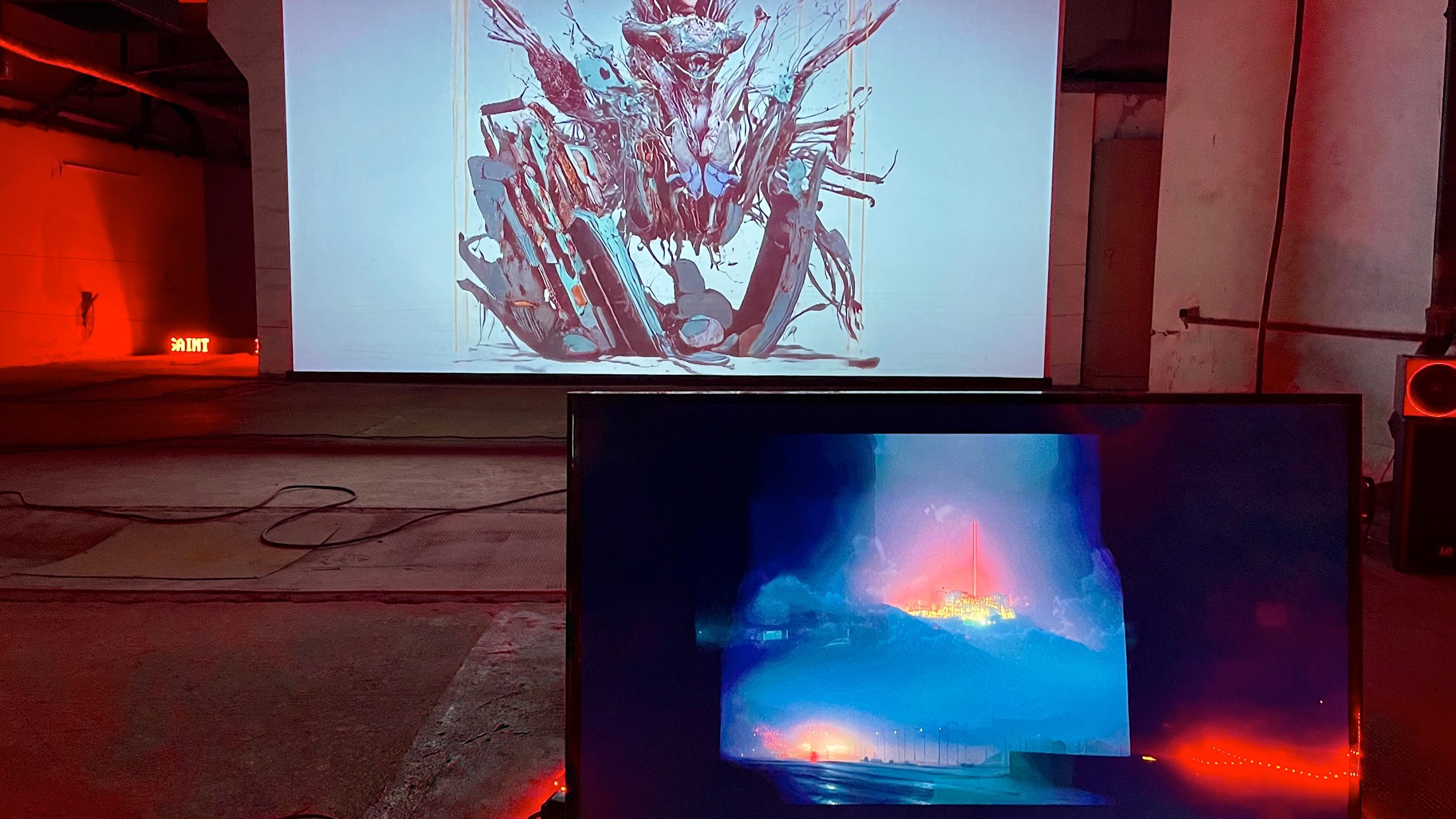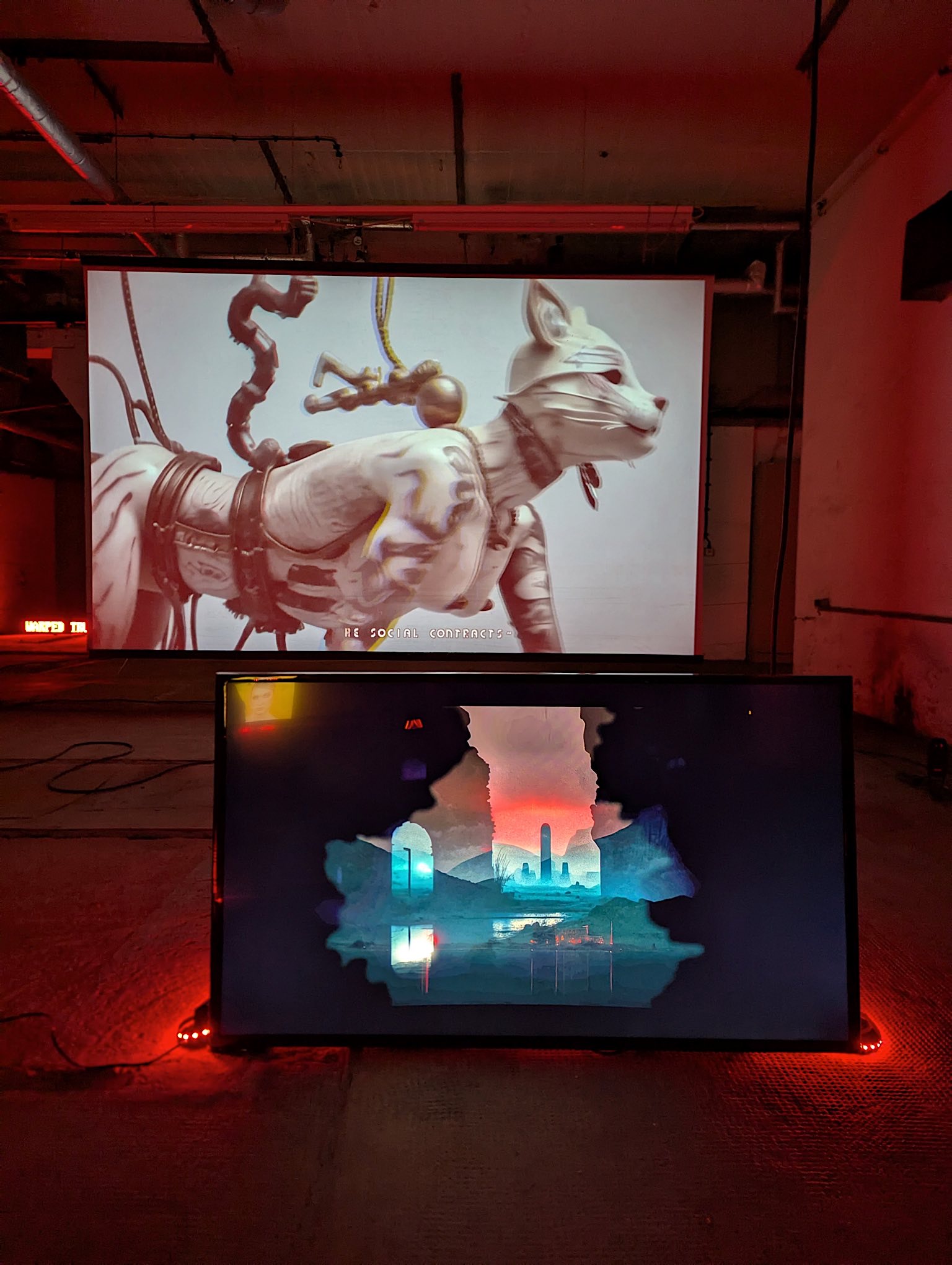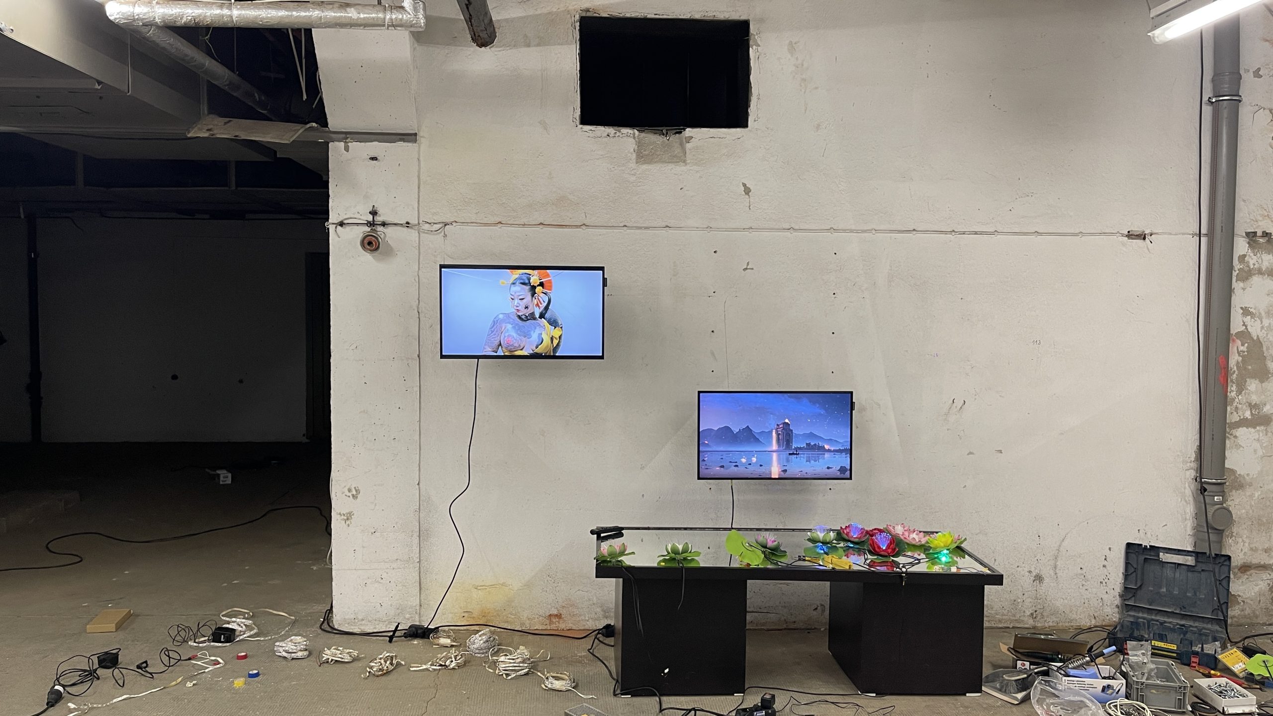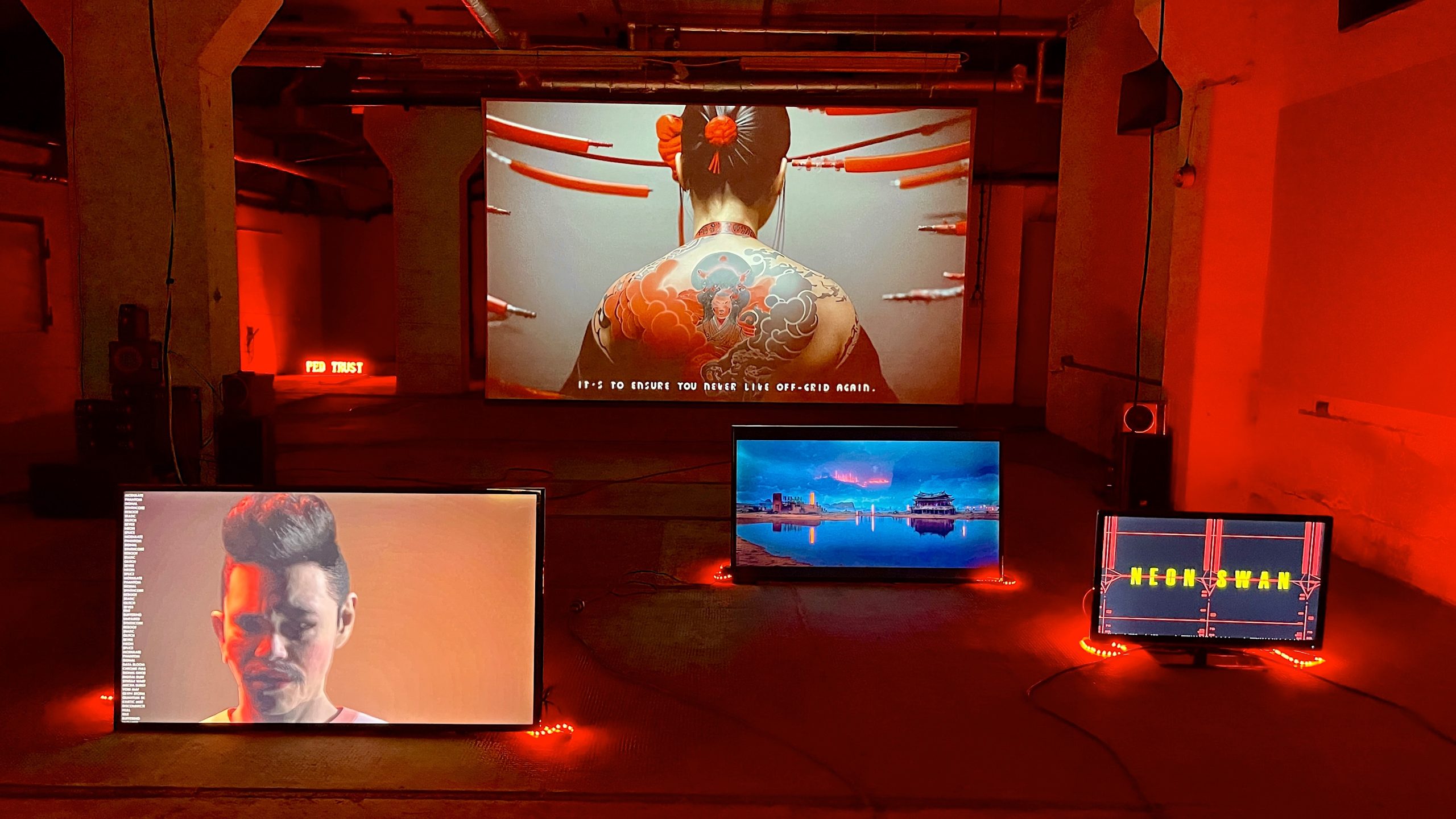 Deep within a subterranean space lit by the pulse of screens and wires, Radiances (2.0) transforms the abandoned into the sacred. This immersive installation stages a ritual in which machines appear to dream. Drawing from the aesthetics of tech-noir, crypto-culture, and AI mysticism, the work draws viewers into a fractured zone where identity, memory, and emotion circulate through synthetic veins.