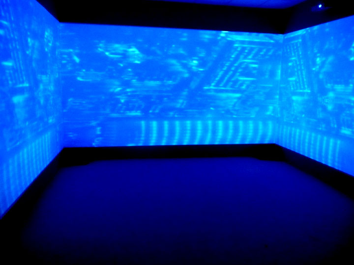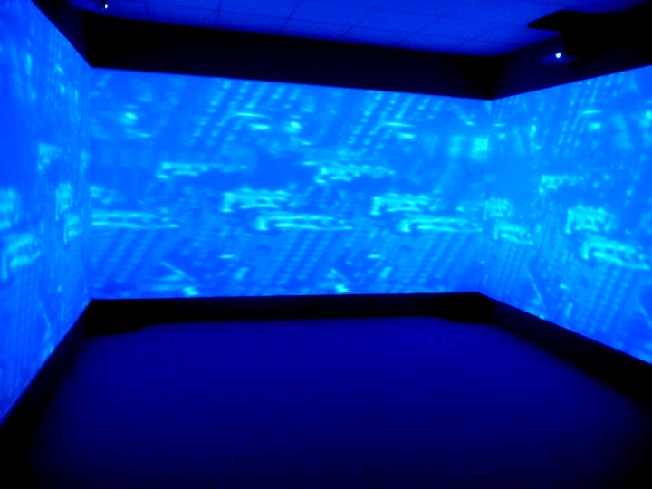 Satellite scanning of outer space, inter and outer probes of kaleidoscopic examinations, signal interceptions and urban schemes form the map and plan for the 5 channel video installation "Organic Urbanic/Tender Prey". Aerial video adjust and joined into science fiction panoramas, short scenarios of urban cosmology, out folding and manifesting itself as a vulnerable planetarium despite its violent surges and tense atmosphere. Reminiscent of data maps as seen through guided missiles and future planet imaginings, the city in Slavin's "Organic Urbanic/Tender Prey" is a mesh of monochrome metal, futurist machine, fantastic architecture, in-versed fields of digitalia and disquiet. A dark star. Tel Aviv transformed into a playground of the future fantastic, relocated and chaotically reconfigured to become a mechanical lost star in a fantasy of dystopian beauty.